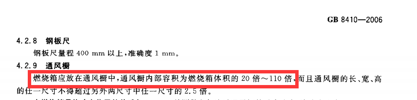2.GB8410-2006要求燃燒箱放置在通風(fēng)櫥內(nèi),通風(fēng)櫥容積為燃燒箱體積的20倍-110倍,LGD-3QCS型儀器燃燒室尺寸為385*204*360mm,通風(fēng)櫥尺寸為1050mm×640mm×1300mm,實(shí)際通風(fēng)櫥容積為燃燒箱體積的約30倍,絕無偷工減料、完全符合標(biāo)準(zhǔn)要求。